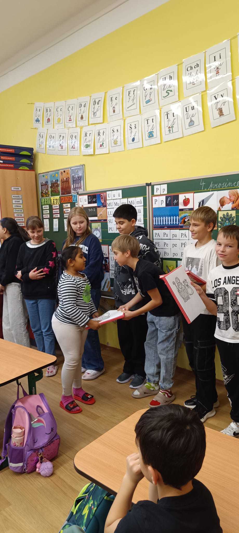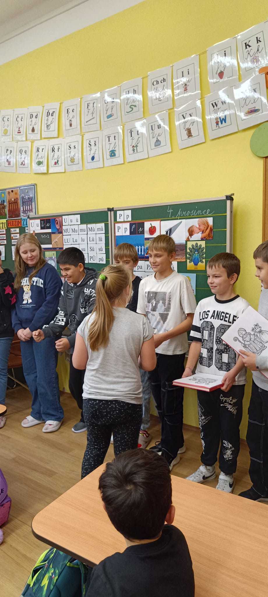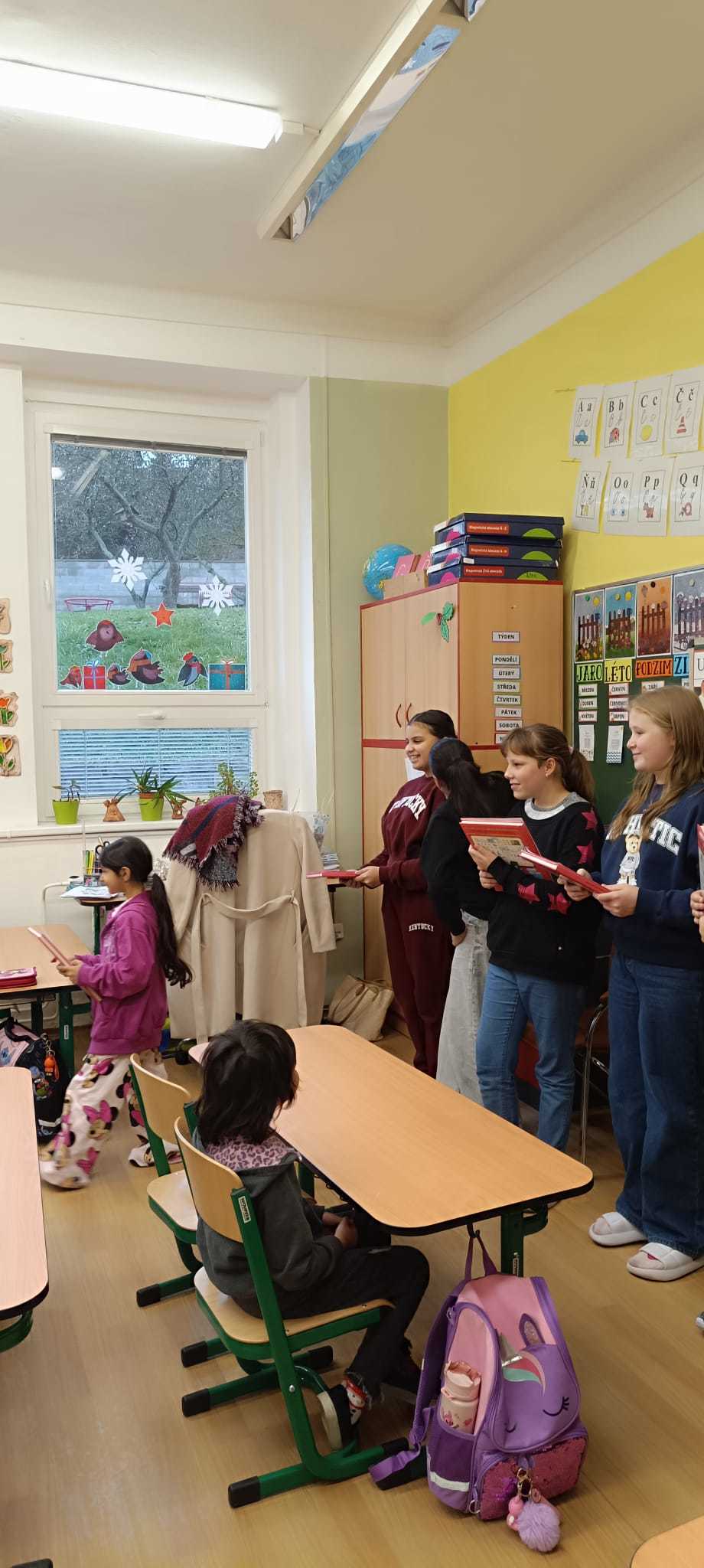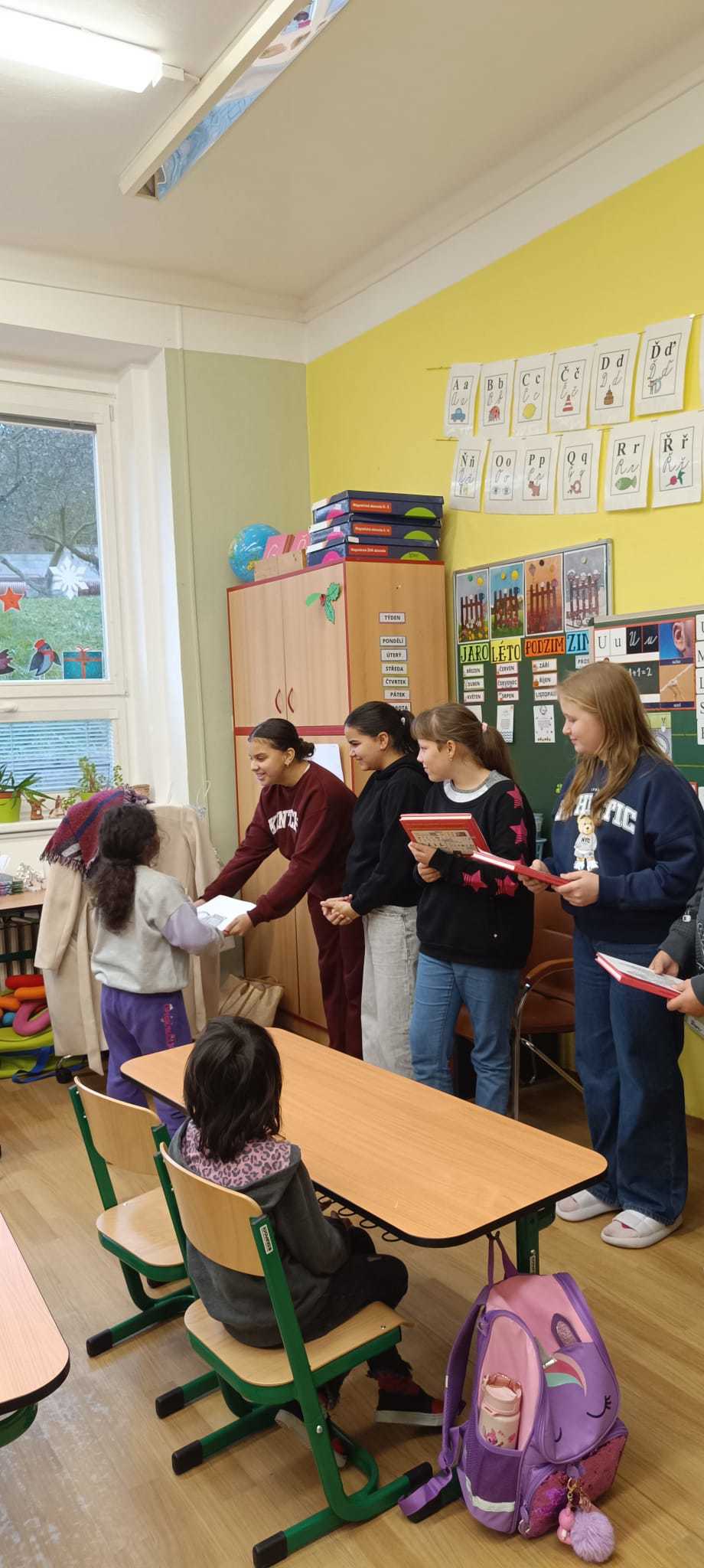 Předávání slabikáře prvňáčkům žáky 5. třídy – milý okamžik, který symbolicky zahájil jejich cestu ke čtení.