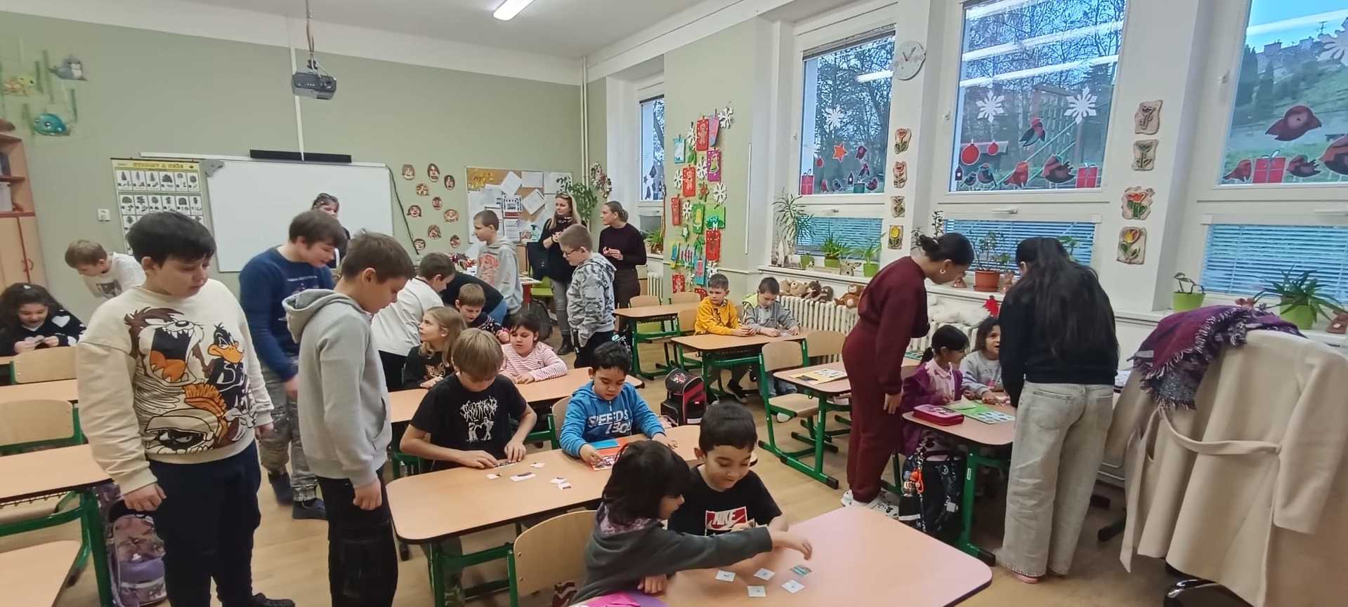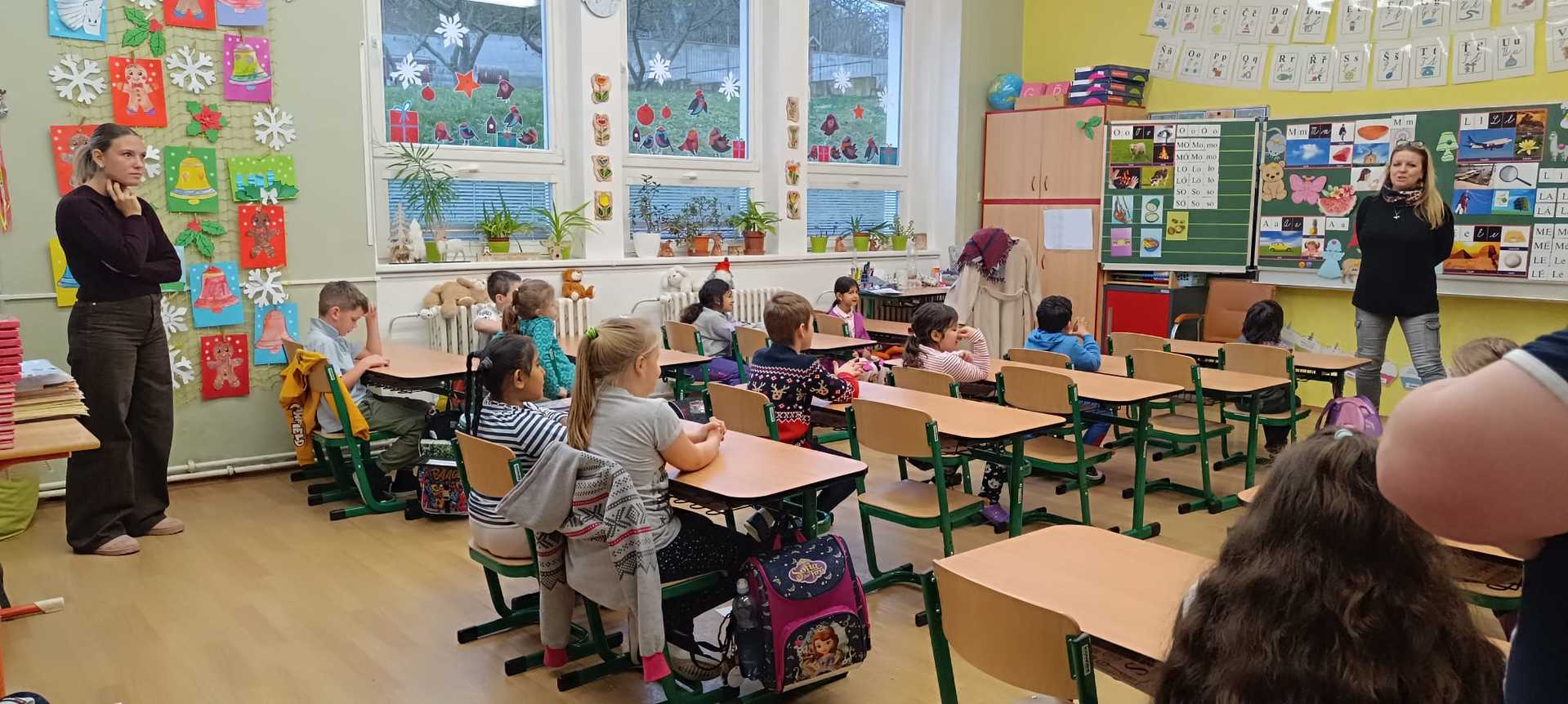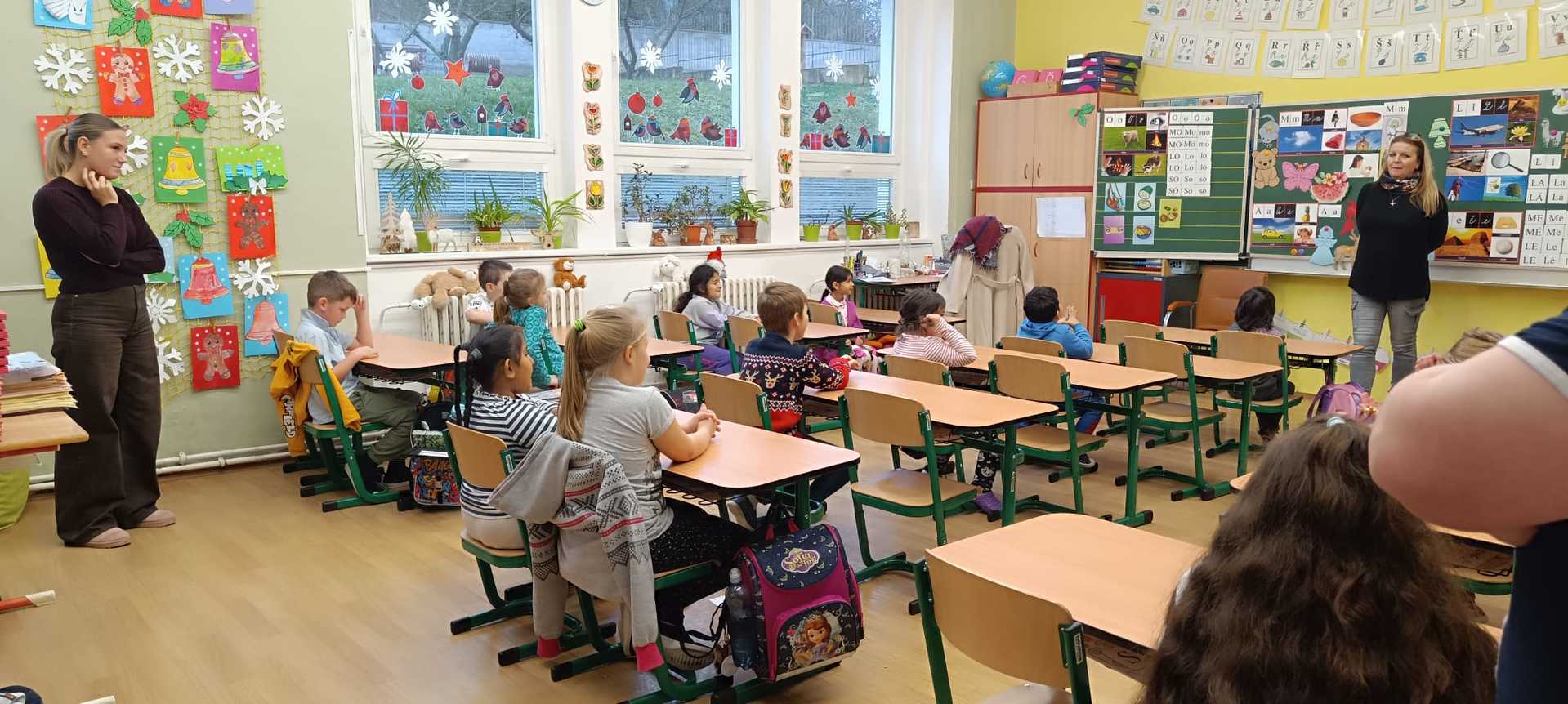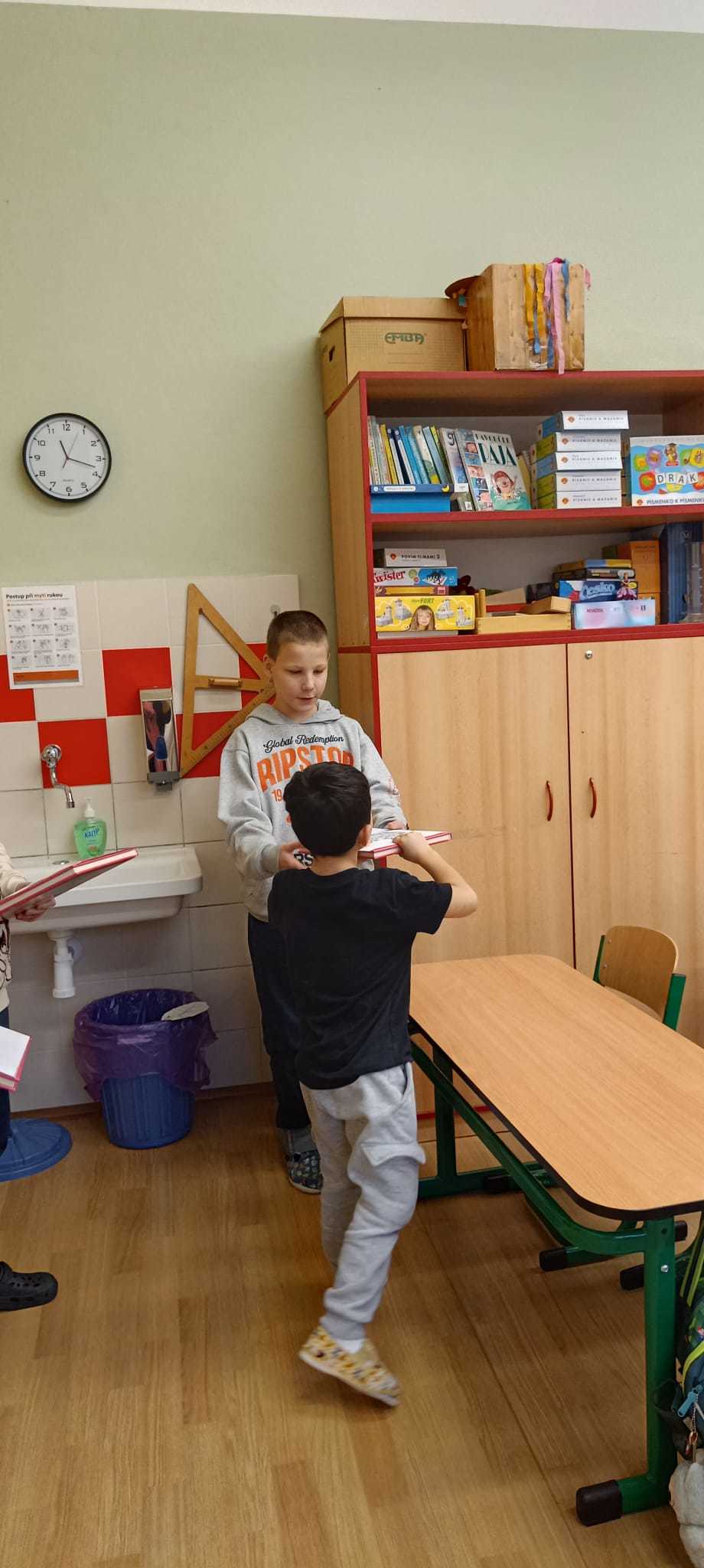 Předávání slabikáře prvňáčkům žáky 5. třídy – milý okamžik, který symbolicky zahájil jejich cestu ke čtení.