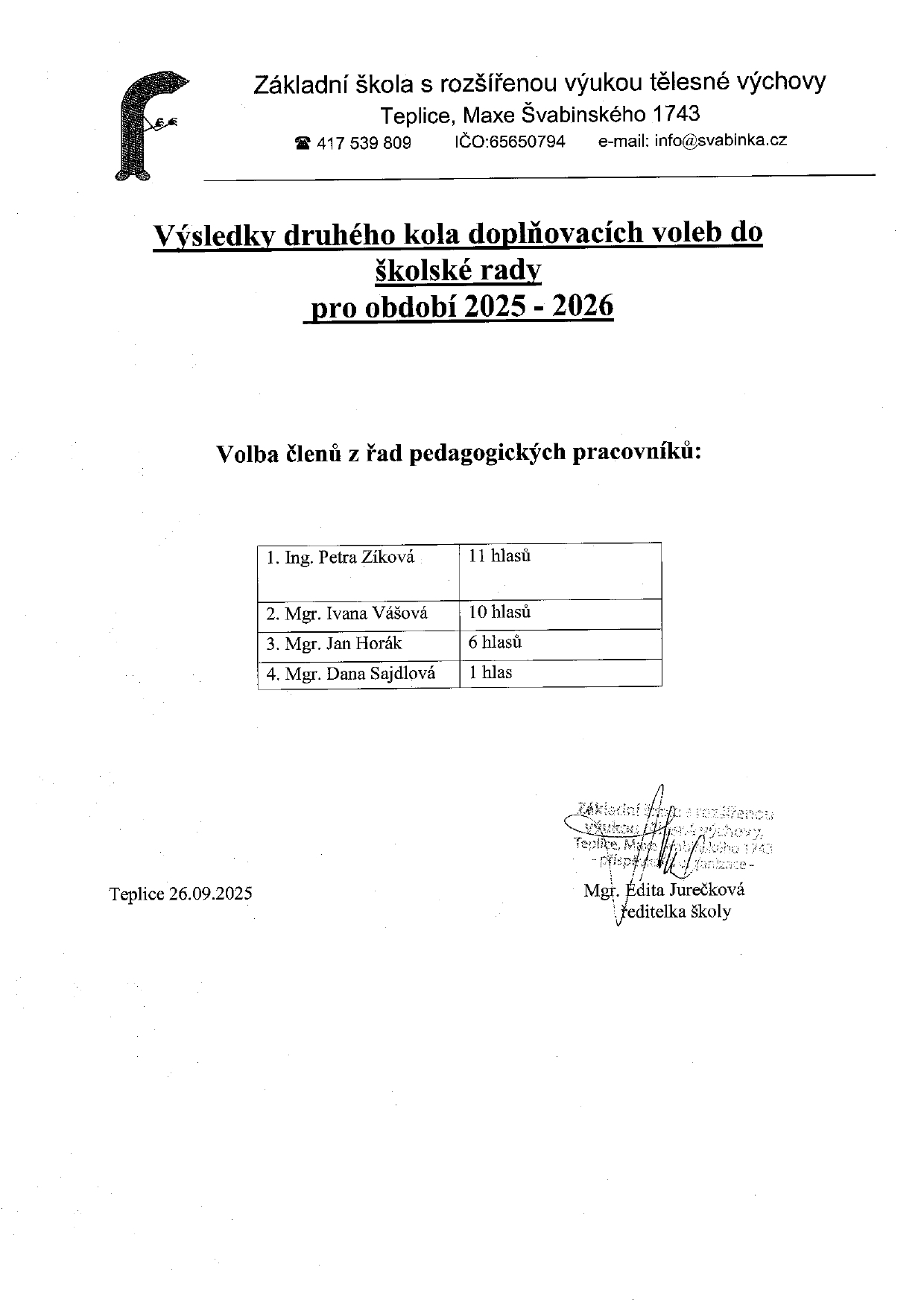 Vyhlášení výsledků druhého kola doplňovacích voleb do školské rady z řad pedagogických pracovníků pro volební období 2025–2026. Podrobné výsledky naleznete v přiloženém dokumentu.